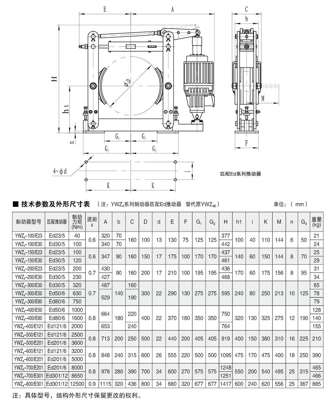 應(yīng)用:YWZ4(YT1)系列電力液壓鼓式制動(dòng)器,廣泛應(yīng)用于有防爆要求的各種起重運(yùn)輸、皮帶運(yùn)輸、港口裝卸、冶金及建筑機(jī)械中各種機(jī)構(gòu)的減速和停車(維持)制動(dòng)。YWZ4(Ed)系列電力液壓鼓式制動(dòng)器,廣泛應(yīng)用于有防爆要求的各種起重運(yùn)輸、皮帶運(yùn)輸、港口裝卸、冶金及建筑機(jī)械中各種機(jī)構(gòu)的減速和停車(維持)制動(dòng)。符合標(biāo)準(zhǔn):YWZ(YT1)系列電力液壓鼓式制動(dòng)器的連接尺寸和制動(dòng)力矩參數(shù)符合JB/ZQ4388-86標(biāo)準(zhǔn),技術(shù)要求符合JB / T6406-2006標(biāo)準(zhǔn)。YWZ4(Ed)系列電力液壓鼓式制動(dòng)器的連接尺寸和制動(dòng)力矩參數(shù)符合JB/ZQ4388-86標(biāo)準(zhǔn),技術(shù)要求符合JB / T6406-2006標(biāo)準(zhǔn)。主要特點(diǎn):▲ 出產(chǎn)配備鉚接式制動(dòng)瓦,如需更換卡裝式需注明;▲ 主要擺動(dòng)鉸點(diǎn)均設(shè)有自潤滑軸承,傳動(dòng)效率高,壽命長,使用中無需潤滑;▲ 采用YT1系列電力液壓推動(dòng)器推動(dòng)器;▲ 常閉式設(shè)計(jì),(斷電)彈簧制動(dòng),(通電)推動(dòng)器釋放。工作條件:◆ 海拔高度:<2000m;◆ 環(huán)境溫度:-20°C?+ 40°C;◆ 相對濕度:≤90%;◆ 工作制:間歇性(S3-60%)和連續(xù)(S1);◆ 電源電壓:三相交流,AC380 50Hz (其他電源等級可按需要定制);◆ 有特殊要求時(shí)在訂貨時(shí)協(xié)商確定。基本參數(shù):● 產(chǎn)品型號(hào):YWZ4-100、YWZ4-150、YWZ4-200、YWZ4-300、YWZ4-400、YWZ4-500、YWZ4-600、YWZ4-700、YWZ4-800● 適用輪徑:100~800mm● 制動(dòng)力矩:40~12500Nm